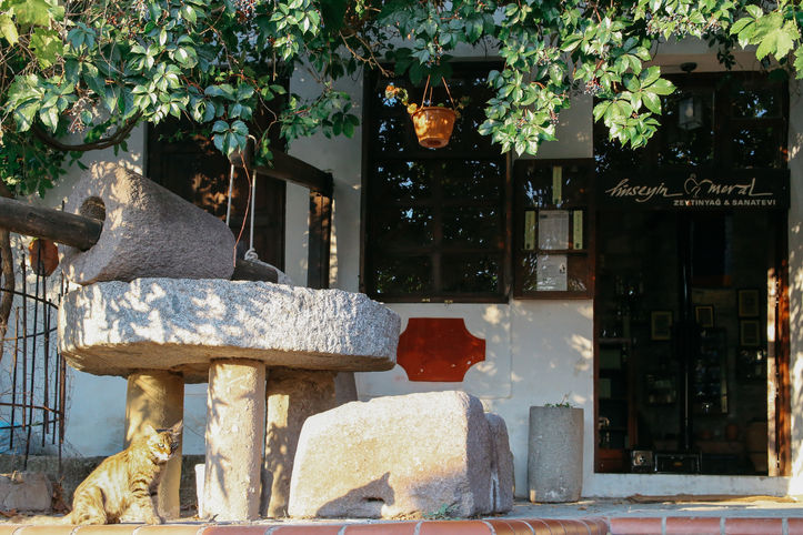 My first stop is Yeşilyurt village. I simply followed the road in the west Küçükkuyu-Ancient City of Gargaron, where Zeus refers to as “It is between the Aegean blue and Ida green” in Iliad and Odyssey by Homer. Just like in the story; it is a village between the Aegean Sea, which is seen from the top of the hill, and among lush pine and olive trees on the hillside of Mount Ida. Its architecture has always been preserved since the period when the Greeks and Turks lived together, and the buildings are built with stones from the region. That’s why I think how lucky those who live here while wandering in the streets. After taking a break in the tea cafe on the village square, I visit the mosque, which has an elegant architecture with its green details and stop by the vendors to buy local products like olives, thyme, honey and bread. Apart from its friendly shopkeepers and plenty of oxygen, the use of natural materials in the products makes this place even more special. I once again understand the value of nature, which is hard to find in urban life, while tasting regional olive oil dishes, the famous Çetmi dessert in the cafes and lavender and thyme flavored ice cream of Yazgara Mola.
